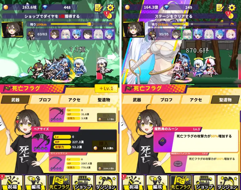 お金を稼ぐとフラグちゃんの武器強化や、神様からの祝福で強化できます。